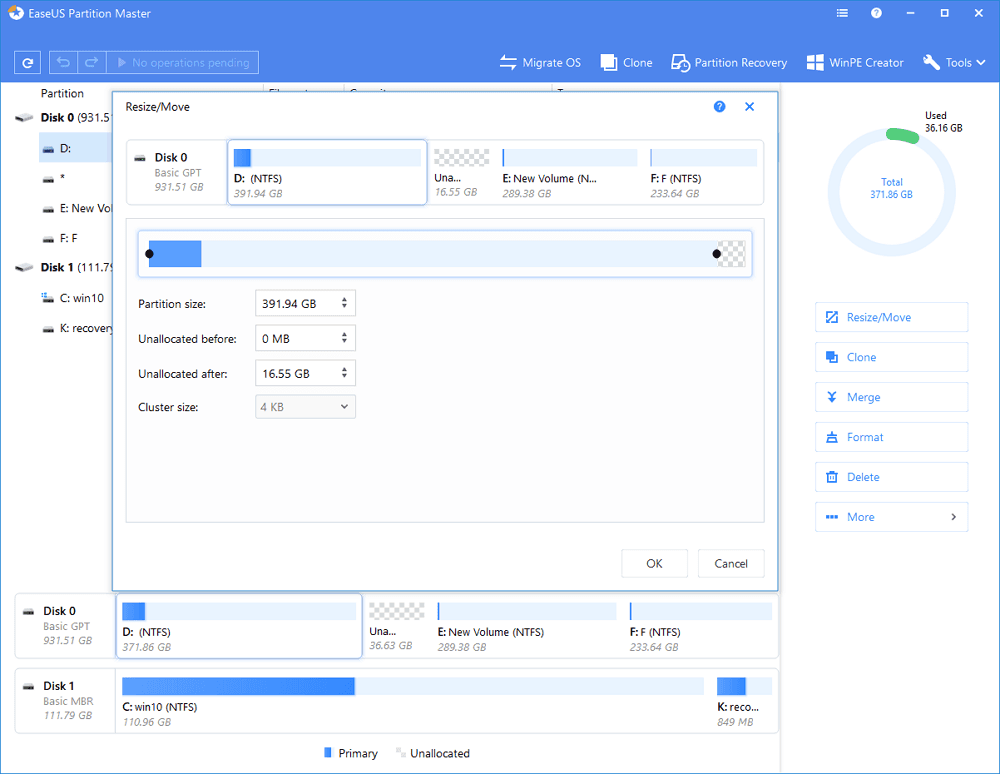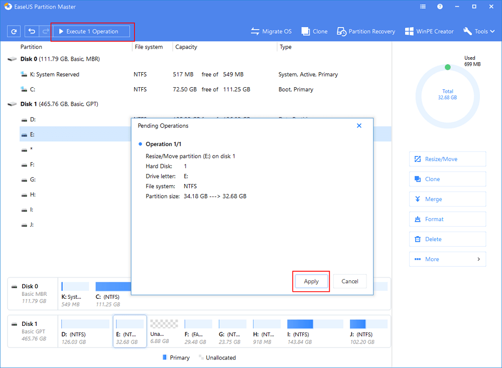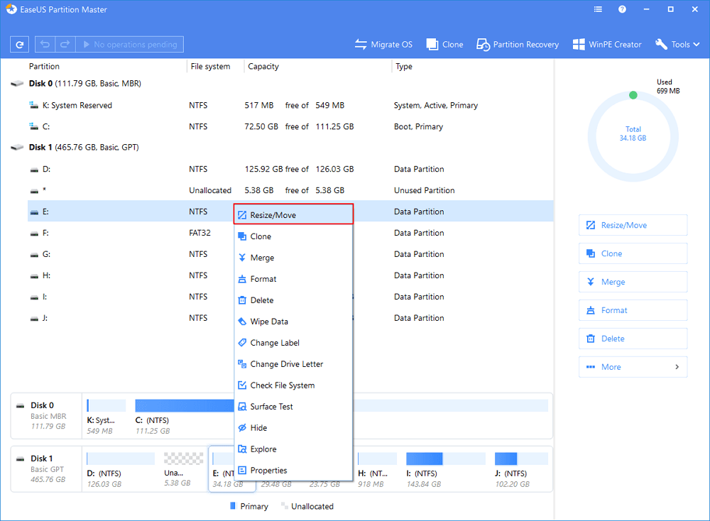 Which drive/partition do you want to adjust its size? Right-click on it and choose “Resize/Move”.