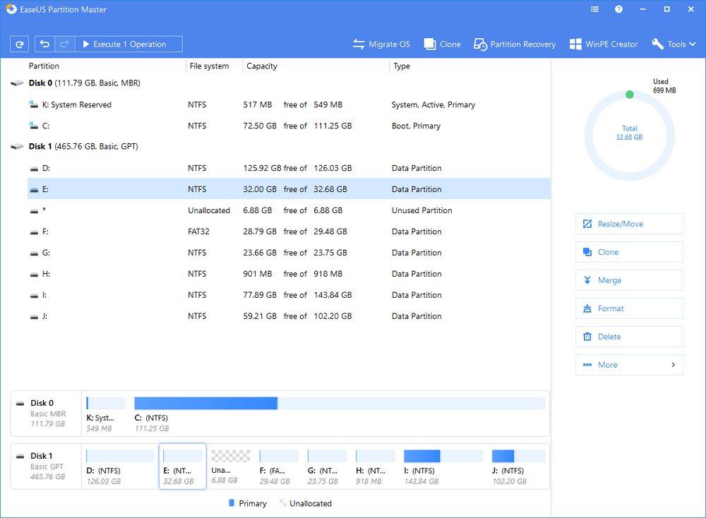 - Resize/move partitions (the Pro version allows to move space from D drive to C drive directly), create, format, delete, and merge partitions